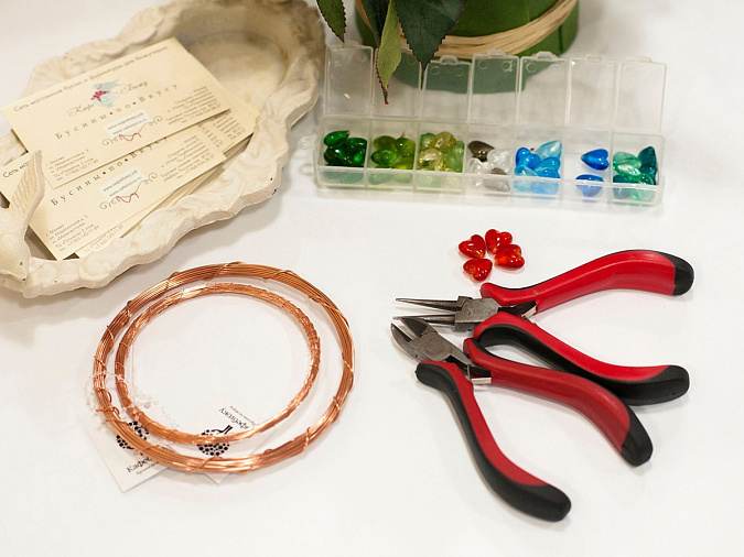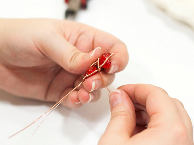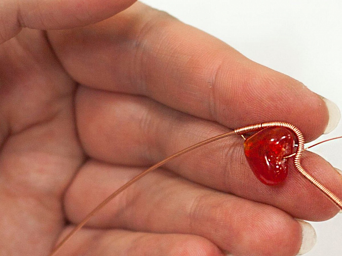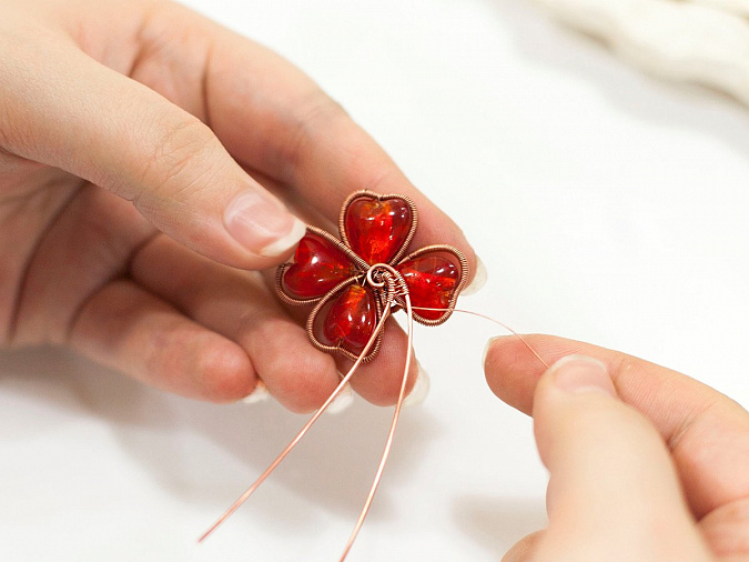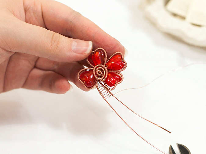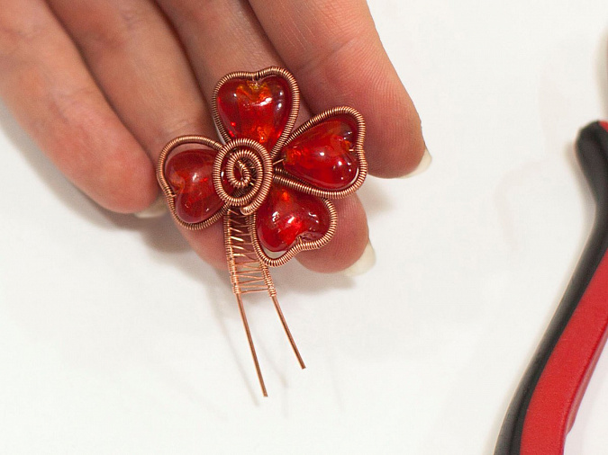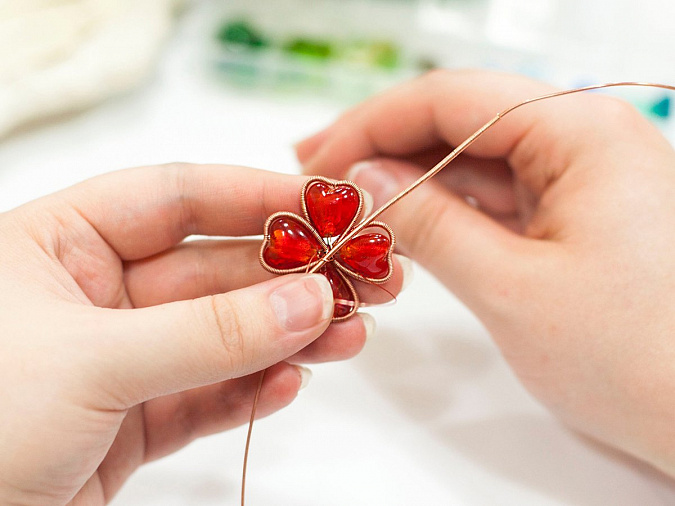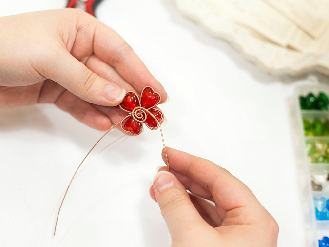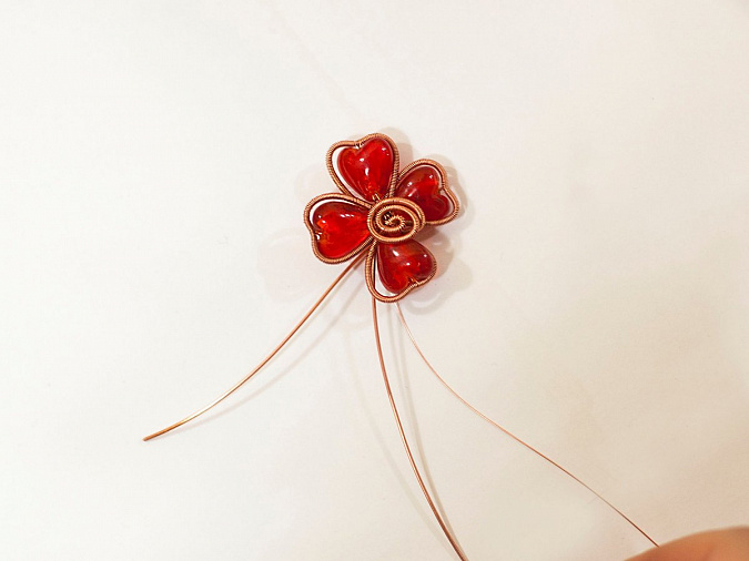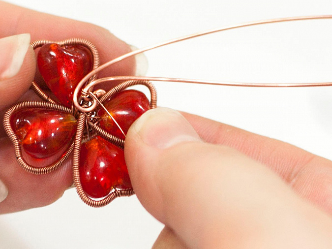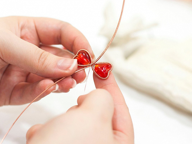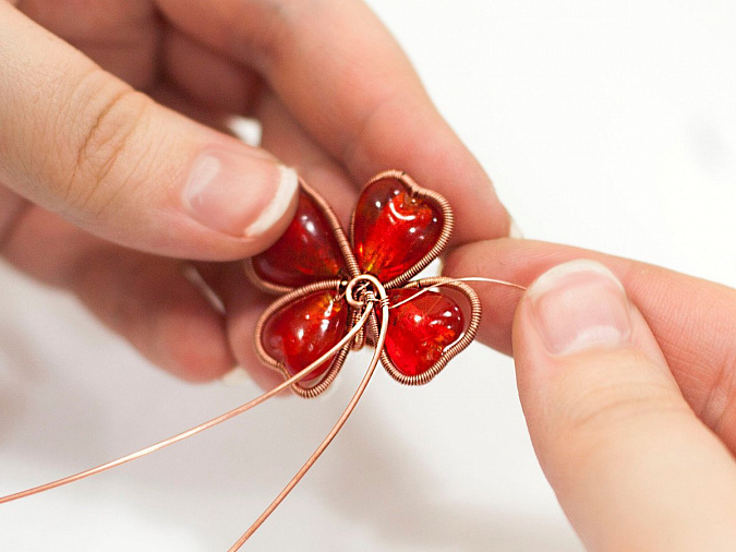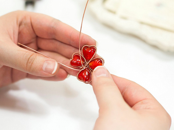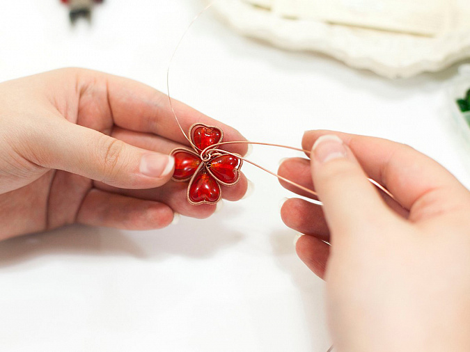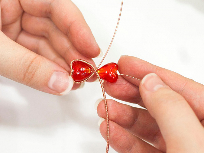 15. Таким же образом оборачиваем проволоку вокруг второго сердечка, так же фиксируя бусину в уголке из проволоки.
