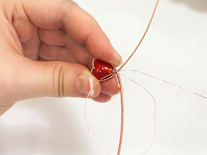 11. Тонкую проволоку пропускаем обратно в бусину, захватив обмотанный конец.