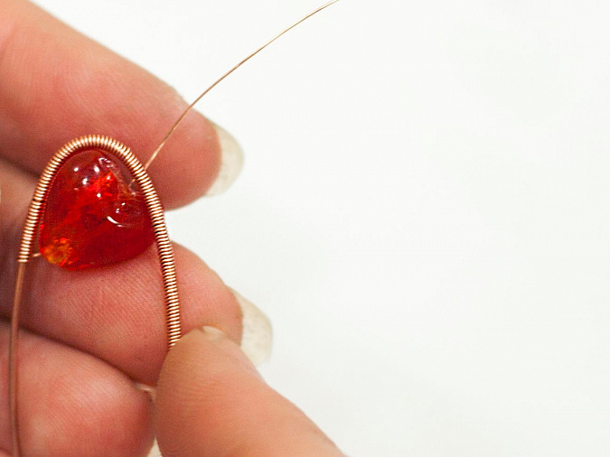 8. На свободный конец тонкой проволоки надеваем одно из сердечек. Если проволока закончилась, то возьмем новый отрезок (около 50 см) и сделаем 10-12 витков в продолжении обмотки, потом наденем бусину.
