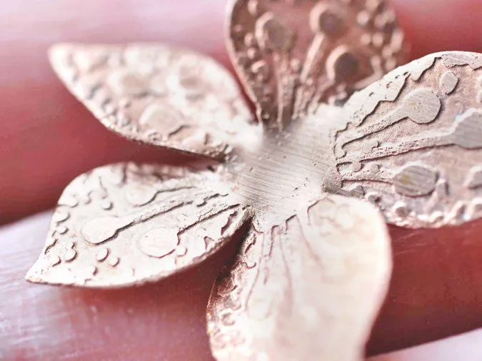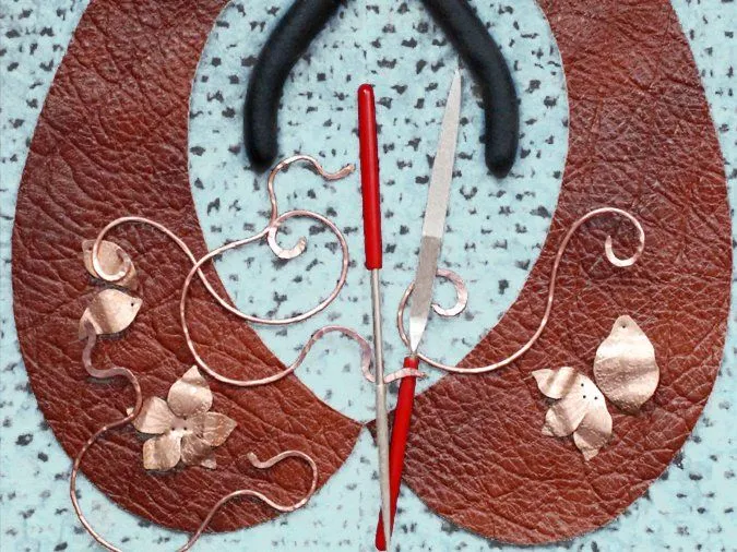 1. Из медного листа вырезаю ножницами заготовки: листики-цветочки; изгибы подпиливаю гравировальником (можно напильником или лобзиком пилить по контуру, но это занятие для терпеливых)