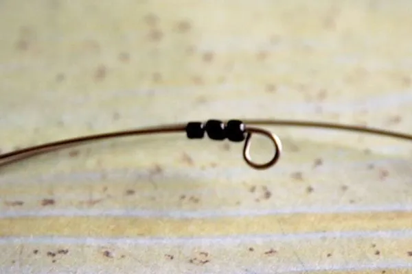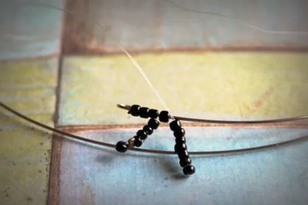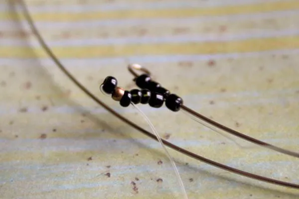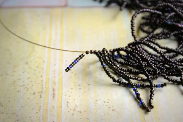 6. Доходим до мемори-проволоки и надеваем ещё одну бисеринку, в неё продеваем длинный хвост лески и снова набираем бисер, нужно вам количество, далее снова отправляем леску в обратном направлении.