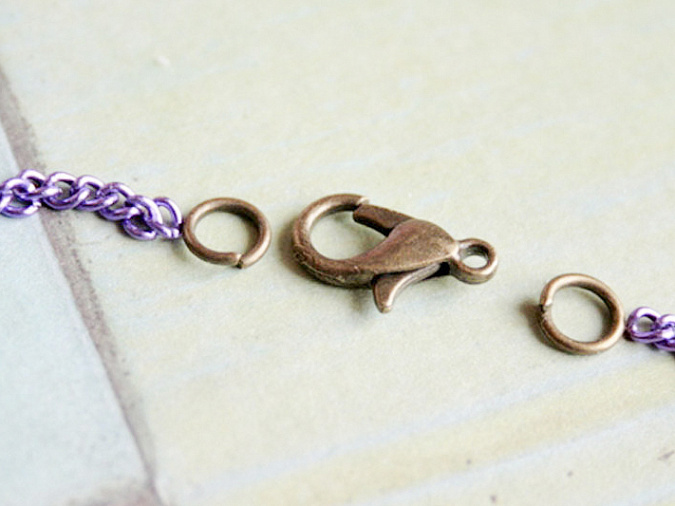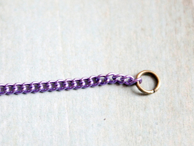 6. Сначала подготовим цепи. Разрежем фиолетовую цепь на 2 части по 105 мм. К каждому отрезку цепи прикрепим по 1 одинарному колечку. Обязательно хорошо смыкать кольца, не оставлять зазоров!