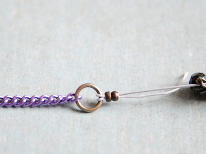 9. Проденем оставшийся «хвостик» в обе зажимные бусинки и подгоним их близко к кольцу. Расплющим их с помощью круглогубцев. Один конец ланки закреплен!