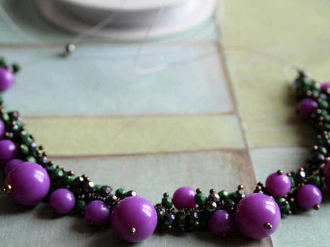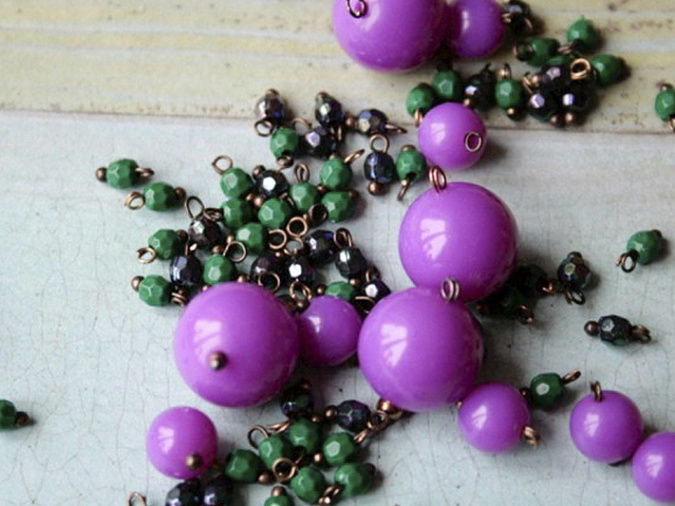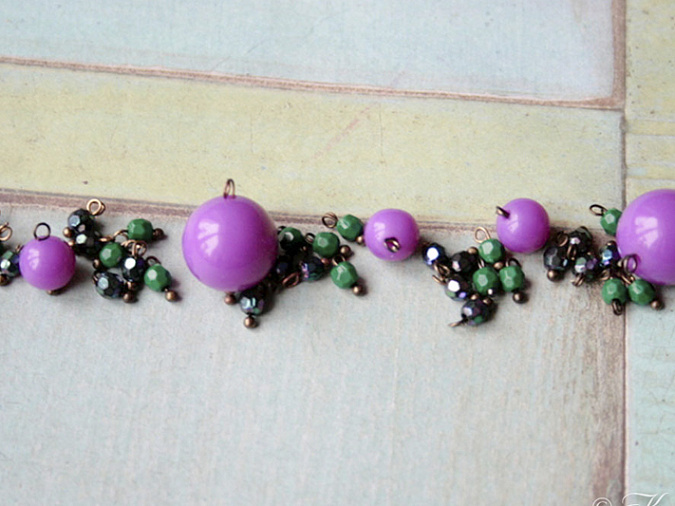 4. Возьмем ланку и начнем нанизывать бусины в таком порядке: 9 шт маленьких бусинок (1 зеленая, 1 перламутровая и т.д), 1 фиолетовая диаметр 6мм, 9 шт маленьких, 1 фиолетовая 6 мм, 9 шт маленьких, 1 фиолетовая диаметр 14 мм, 9 шт маленьких и т.д.