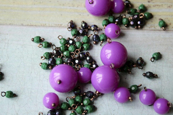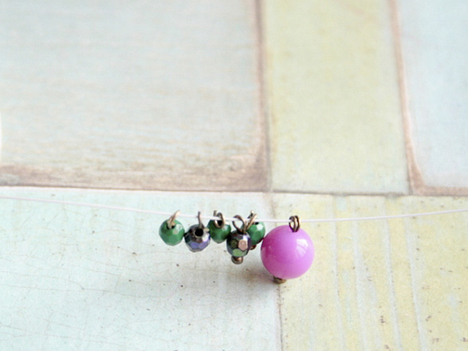 1. Начнем с фиолетовых бусин диаметра 6 мм. Берем один пин и нанизываем на него бусину.