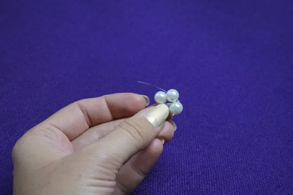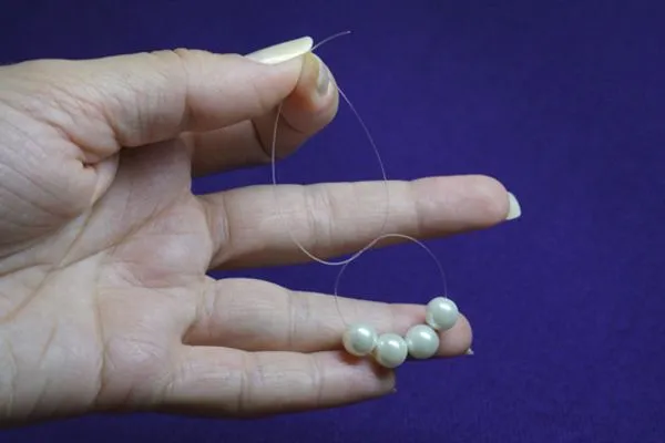 1. Отрезаем 10-15 см. лески. Нанизываем четыре маленькие бусинки, располагаем на середине.