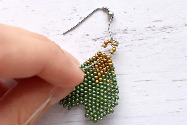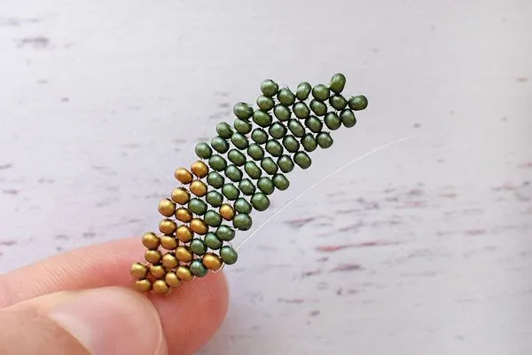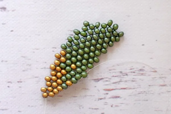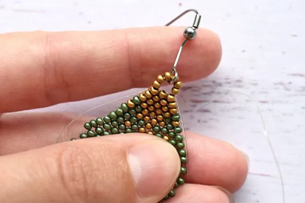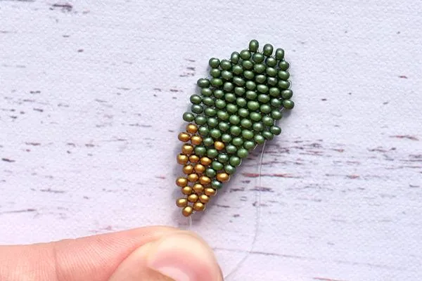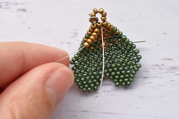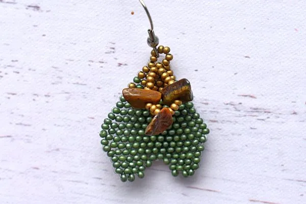 16. Другим концом лески проходим параллельно. Затягиваем, расправляем камушки и с изнанки делаем узелок и убираем лишнюю леску.