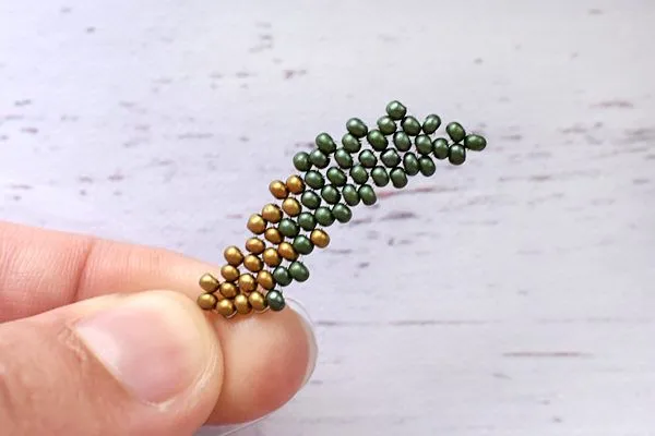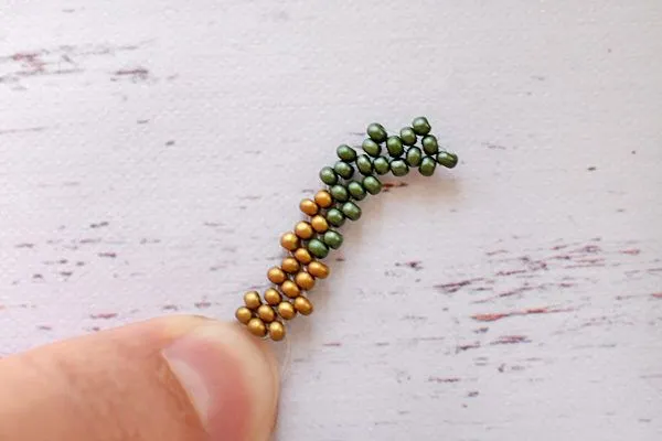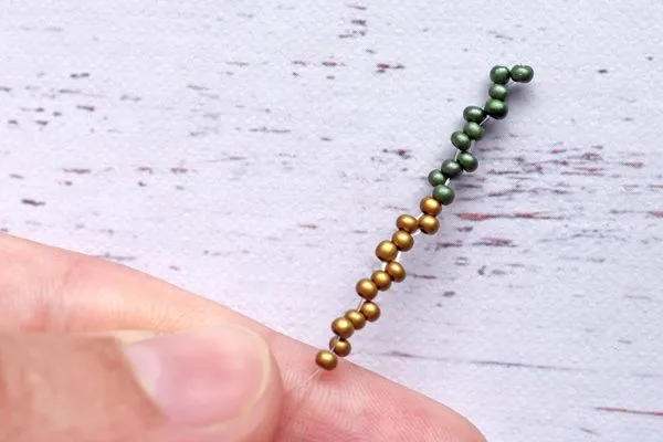 11. Нанизываем 3 бисерины, швензу и снова 3 бисерины. Проходим двумя концами лески параллельно.