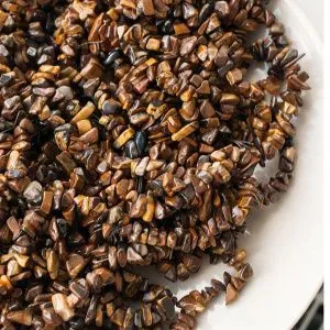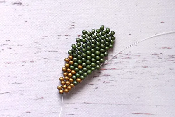 14. Затем на один конец лески нанизываем в таком порядке: 5 бисерин, камушек, 3 бисерины, камушек, 3 бисерины, камушек и 5 бисеринок.