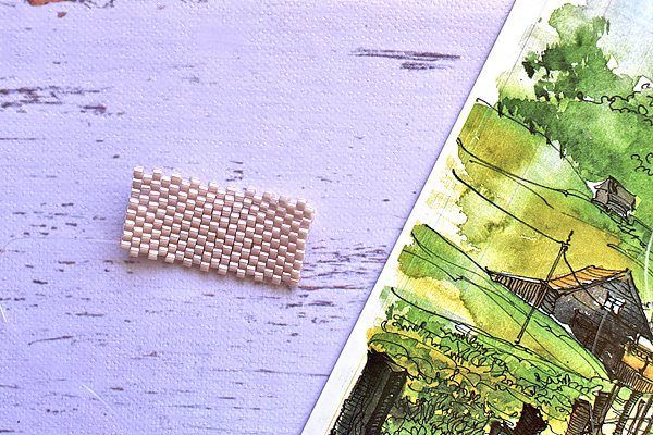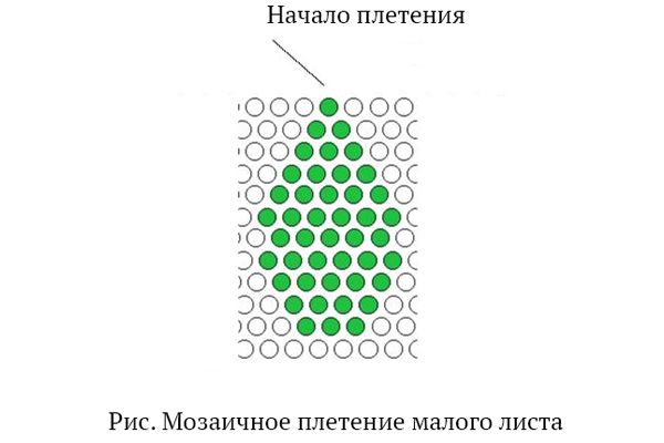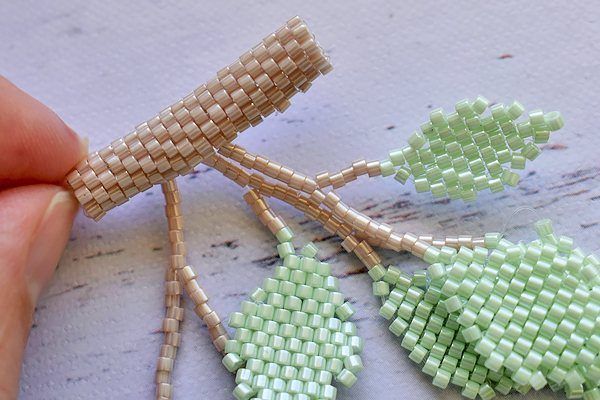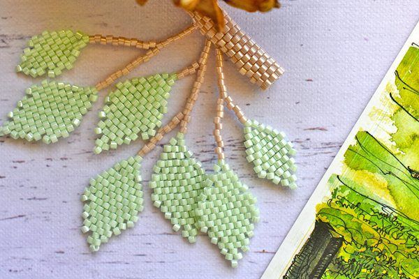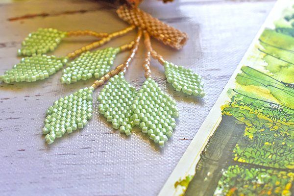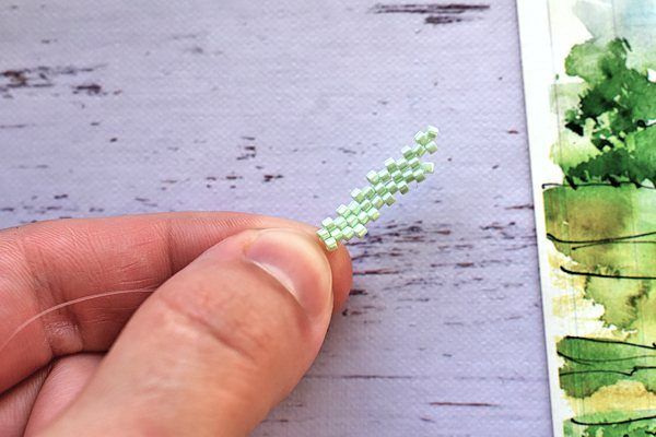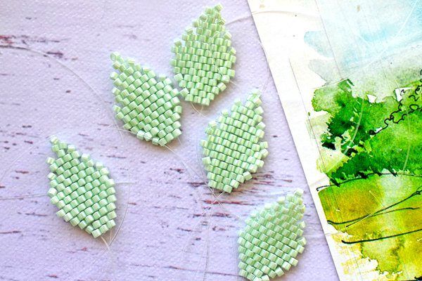 1. Приступим к заготовкам листочков. Листочки плетем в технике мозаичного плетения из светло-зеленого бисера.