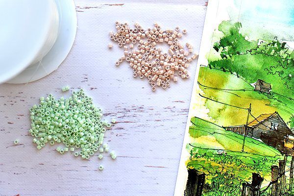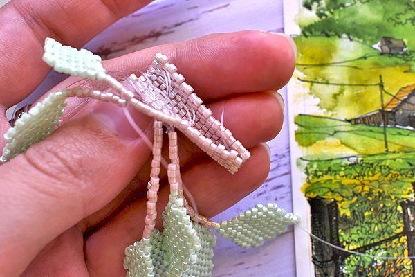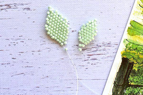 13. Берем лист, на каждый конец лески нанизываем по 1 светло-зеленой бисеринке.