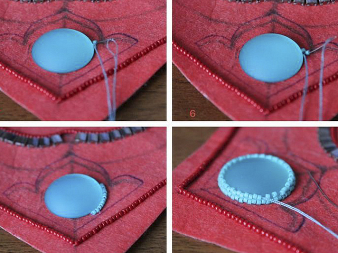 6. Для обработки края беру мононить. С изнанки ввожу иглу с нитью и кладу бисеринку отверстием вверх. Прохожу через отверстие иглой еще раз, затягиваю.