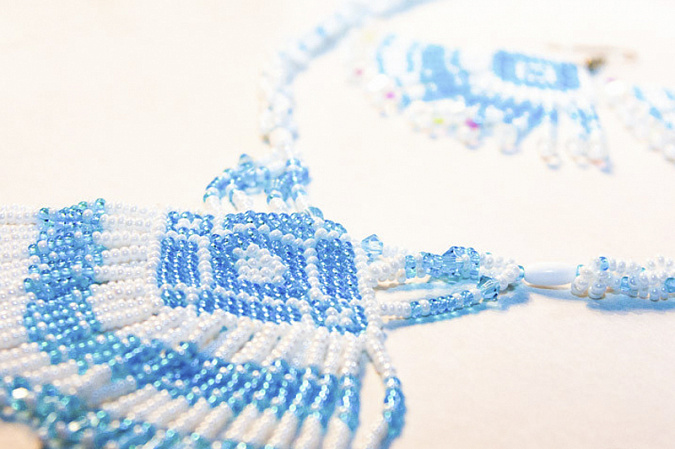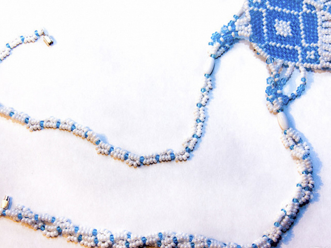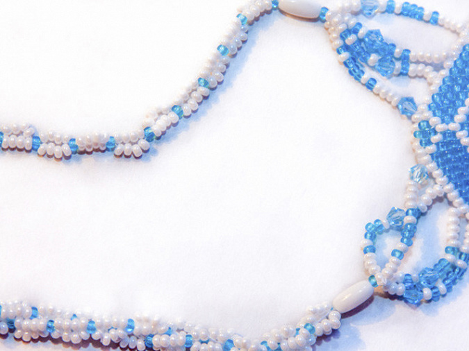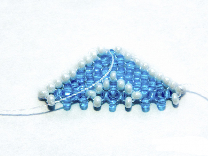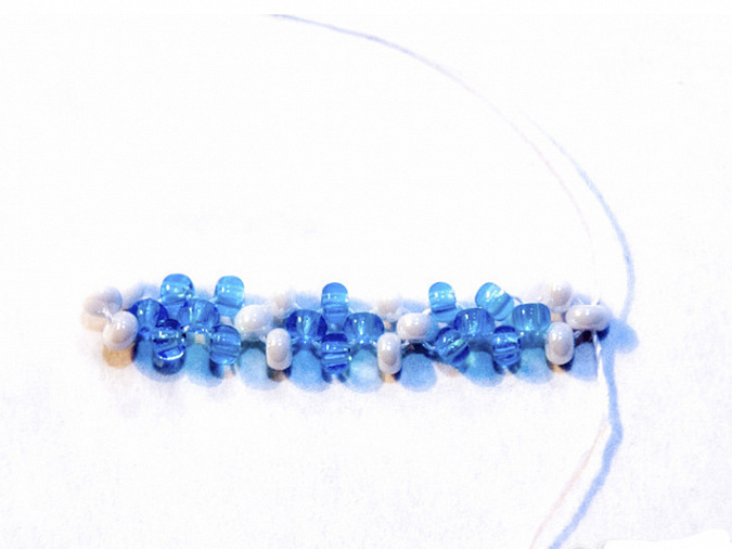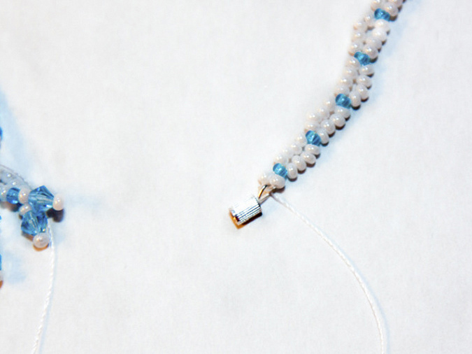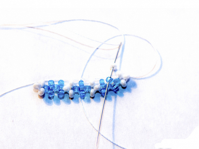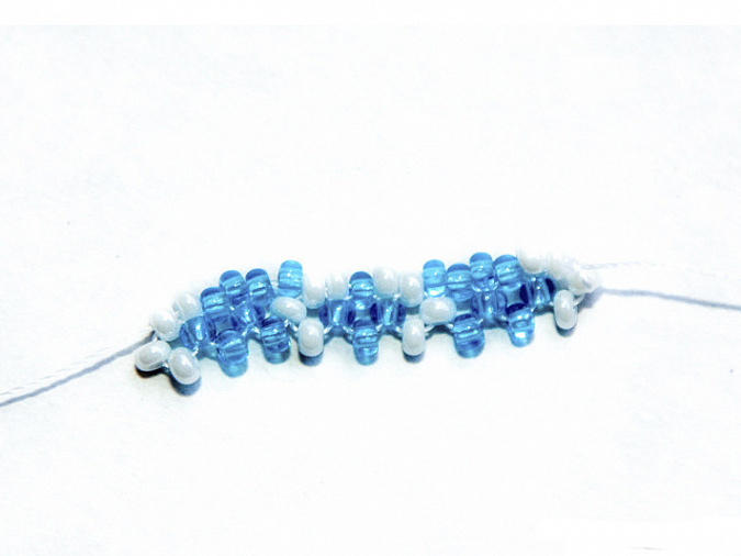14. Продолжаем плести цепочку: теперь проходя через набранную голубую бисерину, набираем еще 4 белых, получится что-то вроде восьмерки: