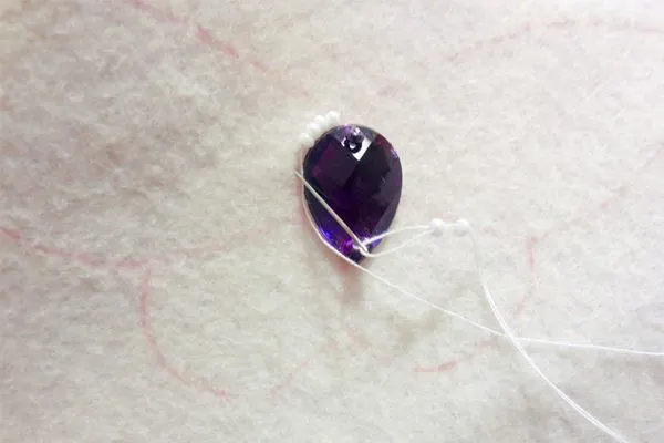 6. Выводим иголку на лицевую сторону из начала предыдущих двух бисеринок, проходим через них и снова набираем две бисеринки.