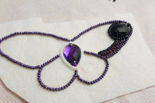 9. Обшиваем темно-фиолетовым край бабочки таким же способом, как и обшивали страз.