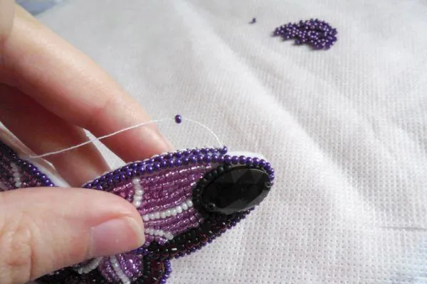 15. Пришиваем бабочку к спинке. Начинаем обрабатывать края вышивки бисером.