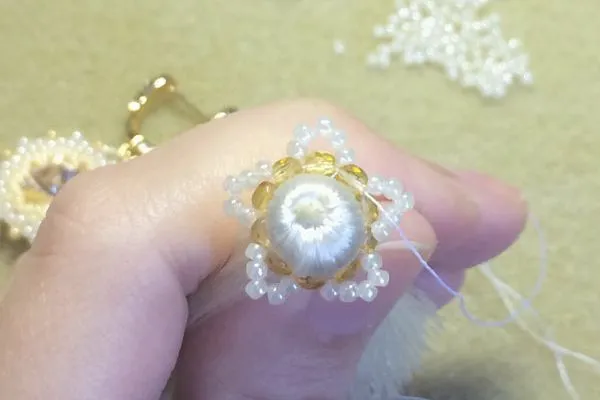16. Выводим нить из средней 15/0 и набираем ещё 5 пятнашек. Проходим в соседнюю среднюю 15/0, снова по кругу и снова затягиваем.