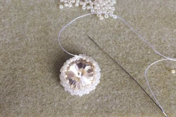 21. Выводим нить из бисерины 11/0 центра оплётки риволи, на фото видно откуда выходим