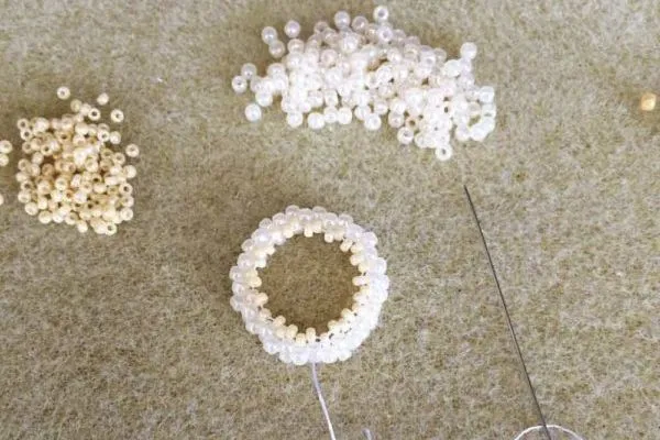 1. Нанизываем на нить 32 бисерины 11/0 и замыкаем круг. Закрепляем нить.