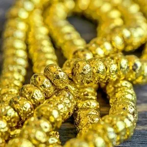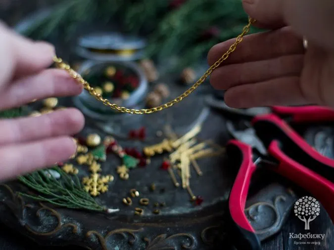 • 6. В таком же порядке, как на фото, нанизываем красные бусинки (7 красных + 1 золотая), периодически сверяем с длиной цепочки