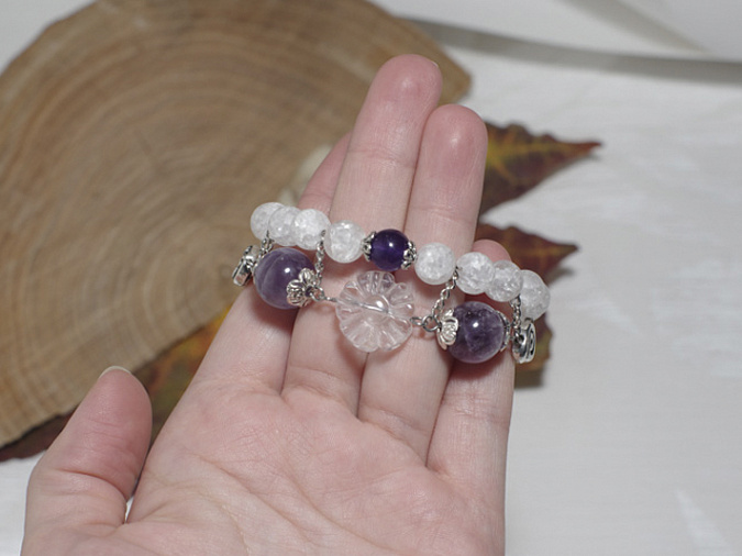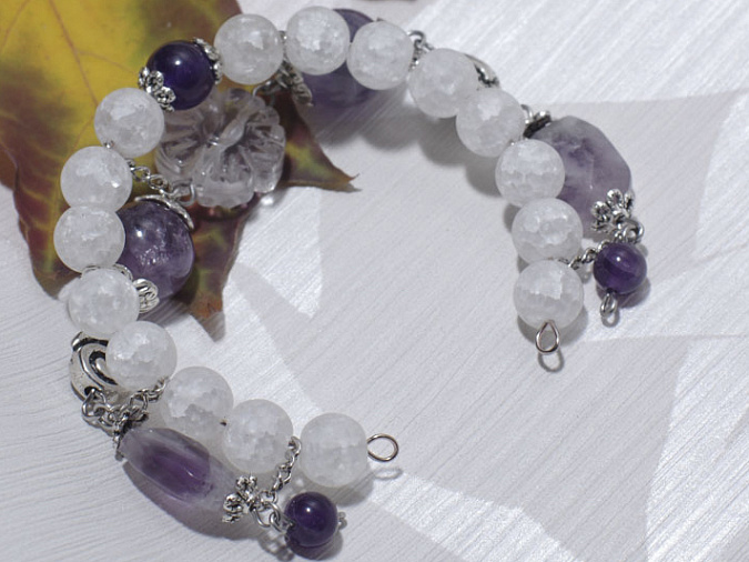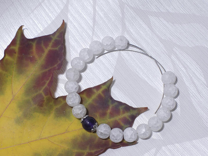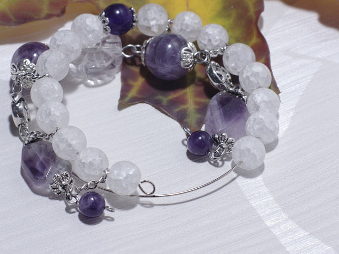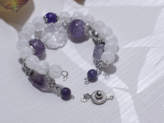 1. Берем бусины кварца и аметиста 8 мм и нанизываем на мемори проволоку. Середину выделяем дополнительно маленькими шапочками. Первая часть нашего браслета готова.