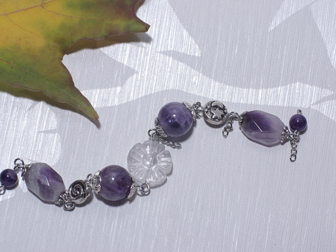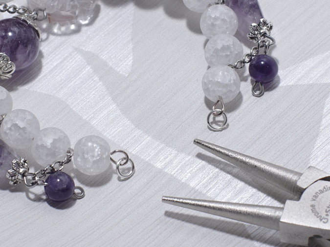3. Металлические бусины располагаем между аметистами. Обратите внимание, бусины стараемся расположить на уменьшение. Собираем бусины между собой. Вторая часть браслета готова.