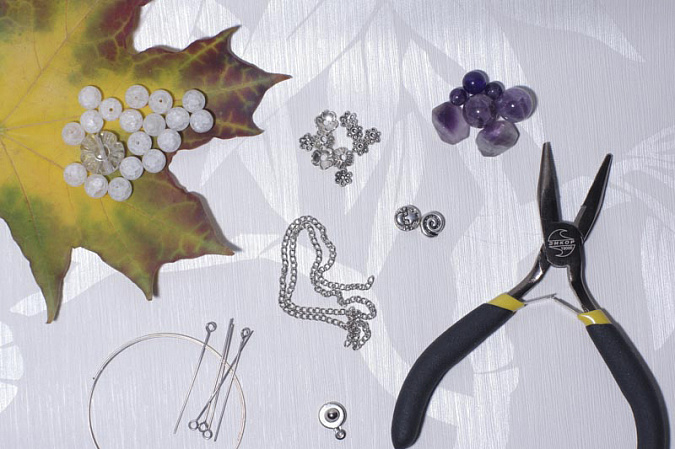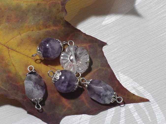 2. Далее собираем оставшиеся бусины на пины. Крупный аметист обрамляем с помощью шапочек.