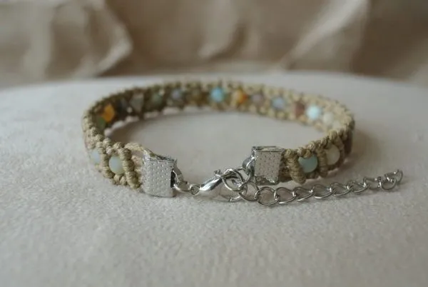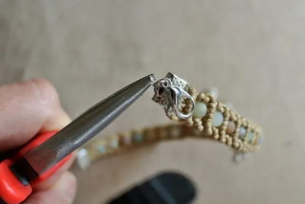 10. Оформляем застежку: с помощью колечка крепим с одной стороны браслета на зажим-концевик – застежку-лобстер, с другой – цепочку.