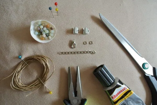 1. Нарезаем нити – 5 шт. по 75 см. Закрепляем по одному концу каждой нити внутри зажима-концевика с помощью клея и плоскогубцев.