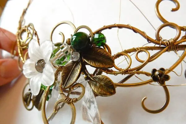 8. Теперь начинаем украшать изделие, прикручивая к основе обмоточной проволокой различные бусины, акриловые цветочки, металлические элементы и другой декор, который подскажет ваша фантазия