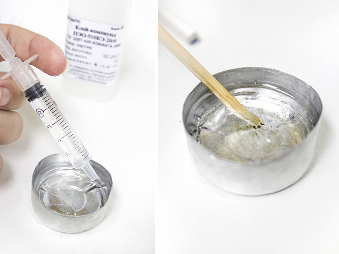5. От нагревания эпоксидная смола размягчается и становится более жидкой. После этого набираем во второй шприц отвердитель и добавляем его в смолу. Чтобы полученная смесь не отслаивалась, ее нужно тщательно перемешивать не менее 5 минут.