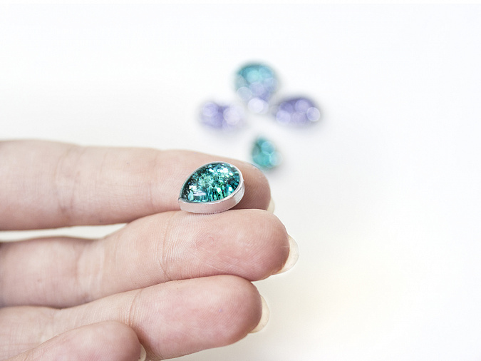 28. К подсохшим капелькам крепим основы для сережек (пуссеты) с помощью эпоксидной смолы. Или основу для кольца или броши, если вы делаете комплект.