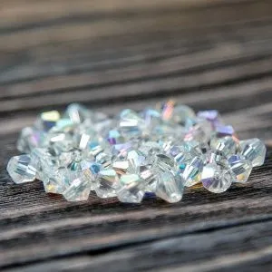 1. Собираем на пины два звена: большое - один большой биконус с двумя разделительными металлическим бусинами, двумя маленькими биконусами и двумя бисеринами; маленький - набираем столько бисера, чтобы длина этого звена равнялась длине большого.