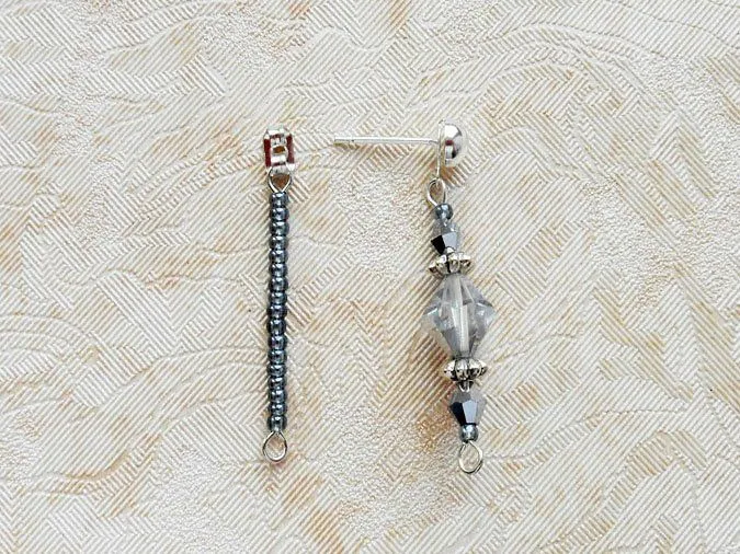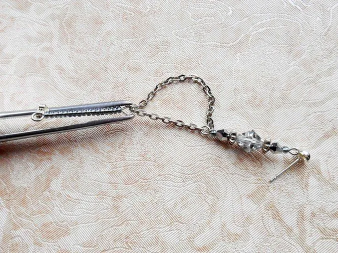 7. Обратите внимание: звенья на переднем и заднем плане соединены цепочками разной длины. Таким же образом делаем вторую серёжку.